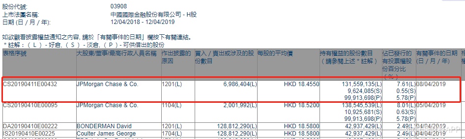 智通财经APP获悉,根据联交所资料显示,中金国际(03908)于4月8日被摩根大通减持698万股,每股作价18.455港元,总值1.29亿港元,最新持股数目1.31亿股,最新持股比例减至7.61%。