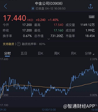 截至今日收盘,中金国际涨1.40%,报17.44港元。