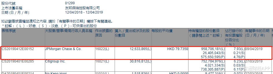 智通财经APP获悉,根据联交所资料显示,友邦保险(01299)于4月9日被摩根大通减持1263万股,每股作价79.735港元,总值10.07亿港元,最新持股数目9.58亿股,最新持股比例降至7.93%。