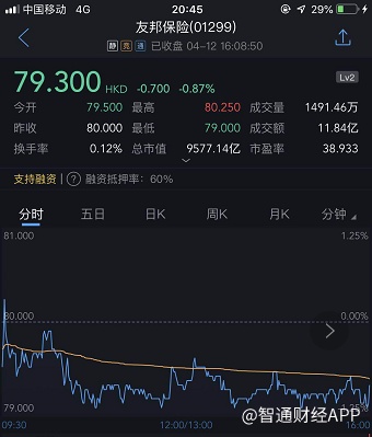 截至今日收盘,友邦跌0.87%,报79.3港元。