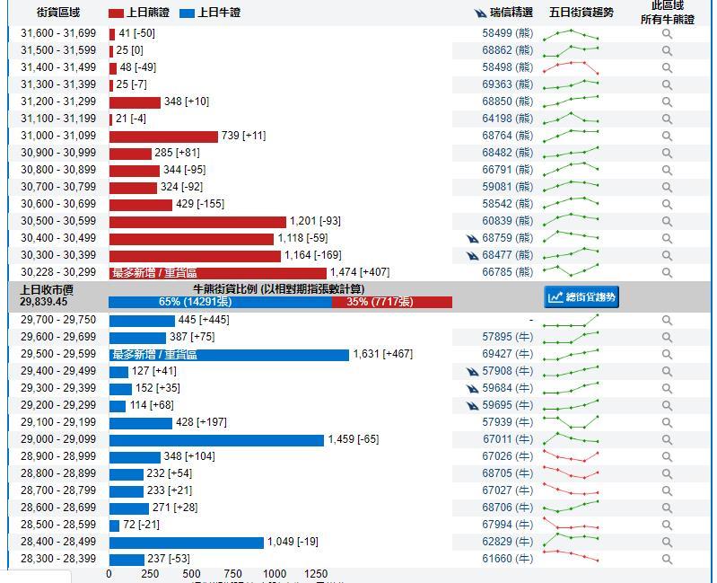 智通财经APP获悉,截至4月12日,恒指最新的牛熊街货比例65:35。从瑞信恒指牛熊证街货分布图中得到的数据显示,熊证街货重货区在30228-30299区间,该区间最新熊证数量为14743张,较上一交易日增加407张;最多新增区间在同一区间。牛证街货重货区在29500-29599区间,该区间最新牛证数量为1631张,比上一交易日增加467张;最多新增区间在同一区间。