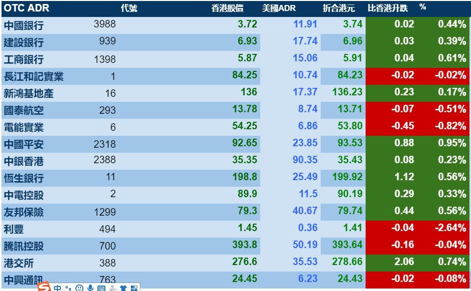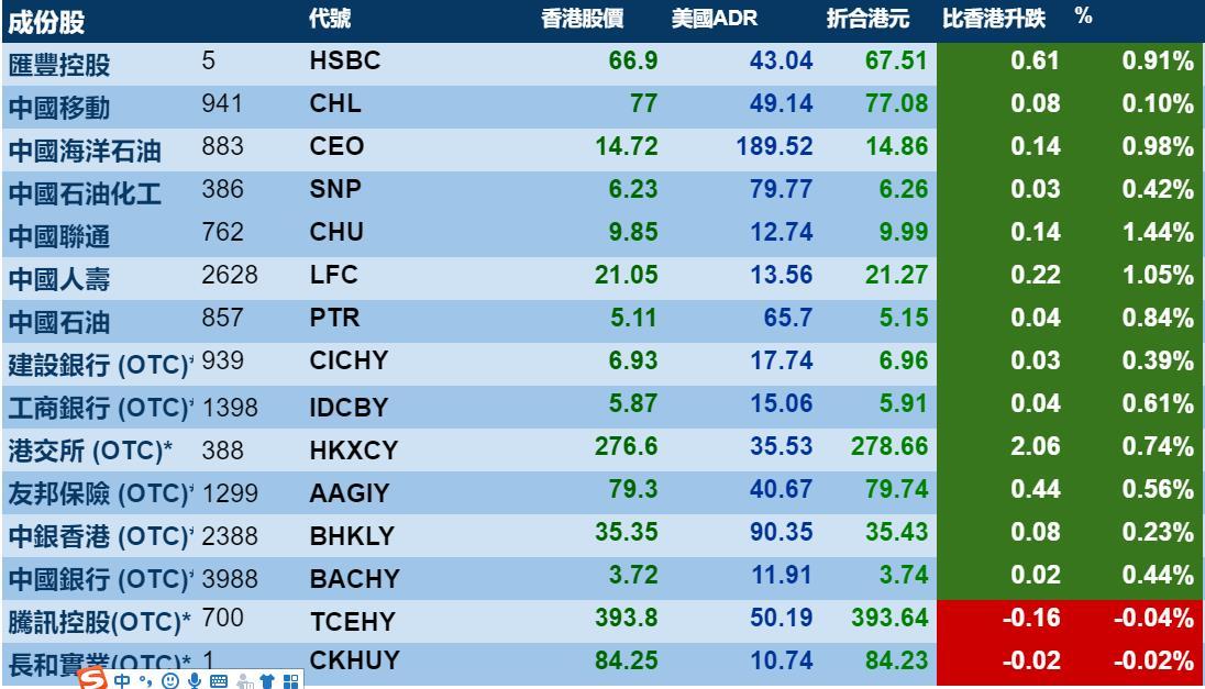 智通财经APP获悉,周五美股大涨,港股ADR指数也走强,按比例计算,收报30034点,较港收市涨124.60点或0.41%。大型蓝筹涨跌不一,汇丰控股收报67.51元,较港收市涨0.61元;腾讯控股收报393.64元,较港收市跌0.16元。