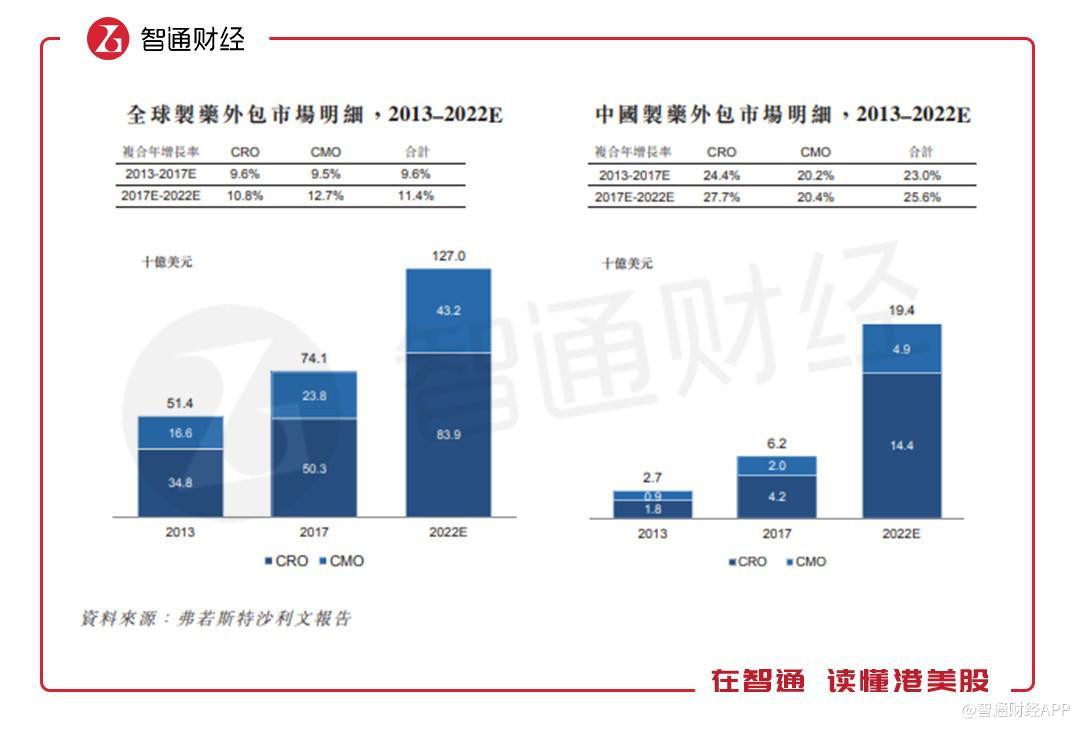 根据弗若斯特沙利文数据,2013-2017年,全球制药外包服务市场复合年均增长率为9.6%,预计2017-2022年加快至10.8%,2020年规模达到1270亿美元。而中国医药行业正处于变革时期,随着针对普药市场以及医保政策的改变,不断激励了中国药企加大创新药的研发投入。因此中国外包服务市场增速相对全球而言更快,复合年增长率预计从24.4%提升至27.7%,CRO和CMO市场在未来五年增长超过一倍。
