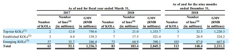 在2017财年、2018财年、2019财年前三季度,如涵的顶级KOL贡献的GMV占比分别为60.7%、65.2%、55.2%。其中2018财年、2019财年前三季度,顶级KOL中,张大奕均排在首位,贡献的GMV占比分别为50.8%、52.4%、53.5%。