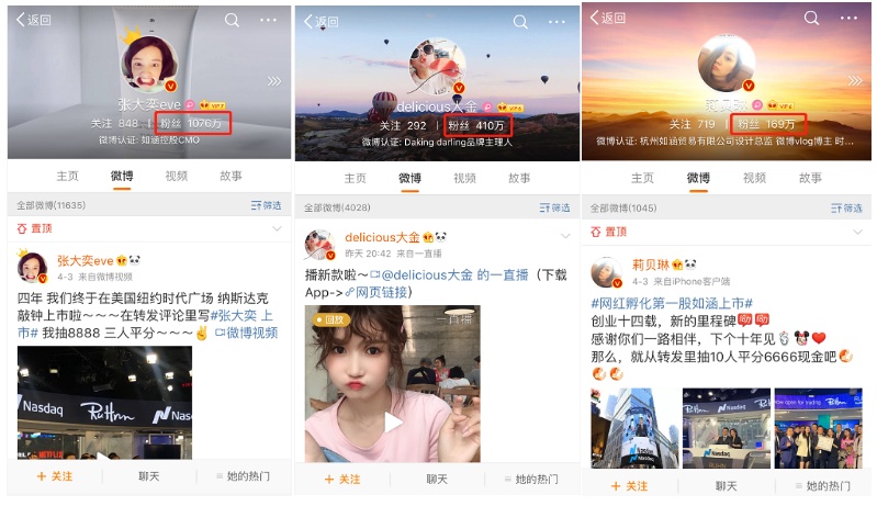 (涵旗下三大顶级KOL张大奕、大金、莉贝琳微博&粉丝数)