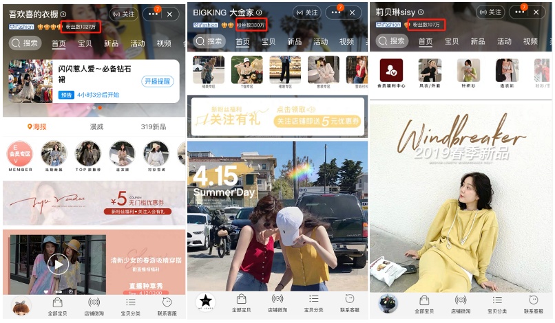 (涵旗下三大顶级KOL张大奕、大金、莉贝琳的店铺&粉丝数)