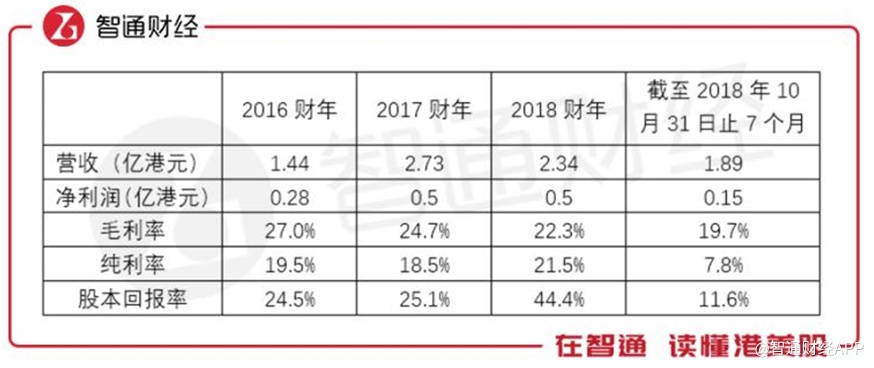 在过去的三年多时间里,公司的营收和净利润表现出极大的不稳定性。智通财经APP获悉,2016~2018财年及截至2018年10月31日止7个月,公司的营收分别为1.44亿港元、2.73亿港元、2.34亿港元及1.89亿港元;净利润分别为0.28亿港元、0.5亿港元、0.5亿港元及0.15亿港元,波动剧烈。