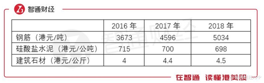 原材料价格方面,最近三年,钢筋和建筑石材的价格亦呈现上涨的势头。智通财经APP获悉,最近三年,香港钢筋的价格分别为3673吨/港元、4596吨/港元及5034吨/港元,价格上涨明显;硅酸盐水泥的价格小幅下滑;建筑石材的价格亦出现上涨。