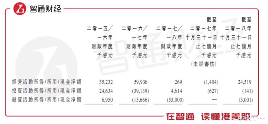 智通财经APP获悉,2016~2018财年及截至2018年10月31日止7个月,公司经营活动产生的现金流分别为3523万港元、5994万港元、27万港元及2452万港元。尤其,2018财年,在加上投资活动产生的现金流和融资活动产生的现金流后,公司的现金流净额为负4812万港元,不仅让人惊呼“纸上富贵”。