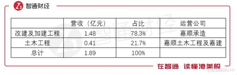 智通财经APP获悉,B & D Strategic Holdings Limited 为香港改建、加建工程及土木工程的专业承建商。公司主要通过旗下三家公司:嘉顺承造、嘉顺土木工程及嘉建,开展业务。据招股书,截至2018年10月31日止7个月,公司实现营收1.89亿元,其中,改建及加建工程的收入占比为78.3%,土木工程的收入占比为21.7%。