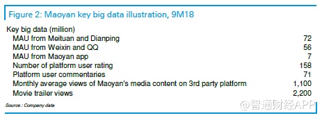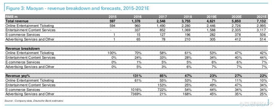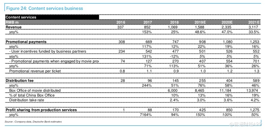 猫眼占中国在线票务市场份额超过60%,处于主导地位。该公司正利用大数据将其业务扩展到上游分销和联合制作业务板块。德银预计在接下来的三年中,由于电影市场份额增长,猫眼的分销和联合制作业务收入将以43%的年复合增长率增长。