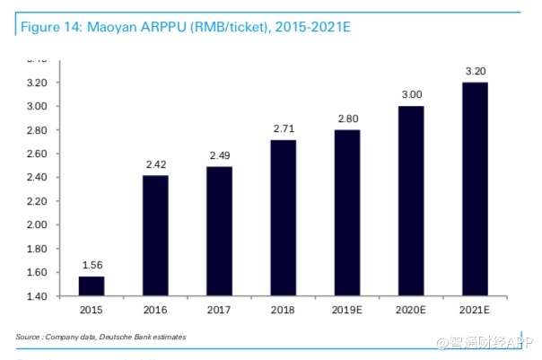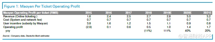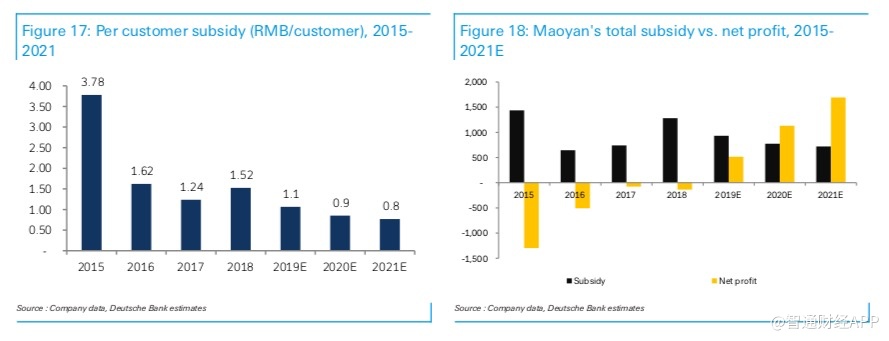 虽然该行预计中国的总票房未来将以较低的个位数增长,但随着内地票房飙升,未来三年内,猫眼的在线票务收入将实现9.5%的年复合增长率。截至2018年,猫眼的每付费用户平均收益只有2.7元人民币,占中国总票价的7.6%。德银预计每付费用户平均收益将在2021财年提高8%至3.2元人民币。此外,该行预估猫眼的人均消费补贴将从2018年的1.52元人民币降至2019年的1.1元人民币,补贴总额将从2018年的12.8亿元人民币降至2019年的0.93亿元人民币。德银预测,2019年猫眼应实现净利润8.33亿元人民币。