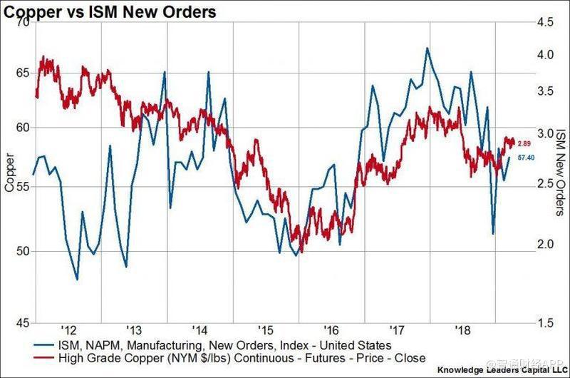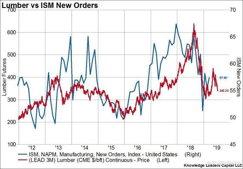 在图2和图3中,分析师分别绘制了木材和铜的价格与ISM制造业新订单指数的对比图——ISM制造业新订单指数被认为是下个季度经济活动的最佳和最一致的指标之一。