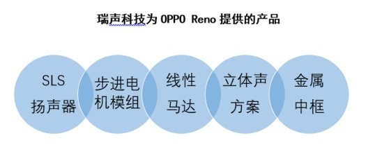 值得关注的是,旭日大数据从多处信源处获悉,除步进电机模组外,瑞声科技还为OPPO Reno提供了SLS超线性扬声器、线性马达、立体声方案、金属中框四大产品。其中SLS超线性扬声器是瑞声科技在微型声学领域的革新性产品,可通过增加振膜振幅, 实现更饱满的低频、更大的音量、更清澈透明的声音表现,目前采用该产品的有华为Mate20 Pro 、P30 Pro和小米9等高端机型。而线性马达相比传统产品,则能够实现更丰富细腻的手感,极大提升了人机交互体验。
