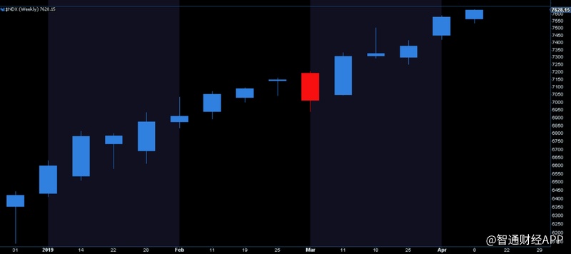 下图是2019年纳斯达克100指数的走势,15周内仅一周下跌,呈直线上升: