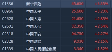 智通财经APP获悉,中金预计内险股首季业绩表现强劲,内险板块AH股全线走强,截至9时40分,新华保险(01336)涨5.55%,报价45.65港元,中国太平(00966)涨3.23%,国寿(02628)、中国太保(02601)、中国平安(02318)及中国财险(02328)均涨超2%。