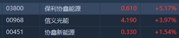 智通财经APP获悉,光伏板块今日领涨大市,截至发稿,保利协鑫能源(03800)涨5.17%,信义光能(00968)涨3.97%,协鑫新能源(00451)涨1.54%。