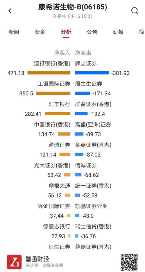 更让人惊奇的是,盘口席位全是大行扫货。从智通财经APP数据中心显示,卖出多为打新账户,而渣打银行、工银国际、汇丰、摩根、德意志等券商均在净买入券商。截止4月13日,渣打代持股比例高居9.5%,约1260.9万股;小摩代持1113.03万股,约8.39%;大摩持股531.9万股,约4.01%。这态势和牛股药明生物(02269)的券商持股如出一辙。