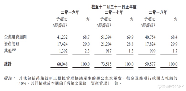 禹铭为提供企业顾问服务及资产管理服务的金融服务供应商。截至2018年12月31日止三个年度各年,禹铭企业融资顾问服务产生之收益分别约为4120万港元、5140万港元及4080万港元,分别占禹铭总收益约68.7%、69.9%及68.4%。