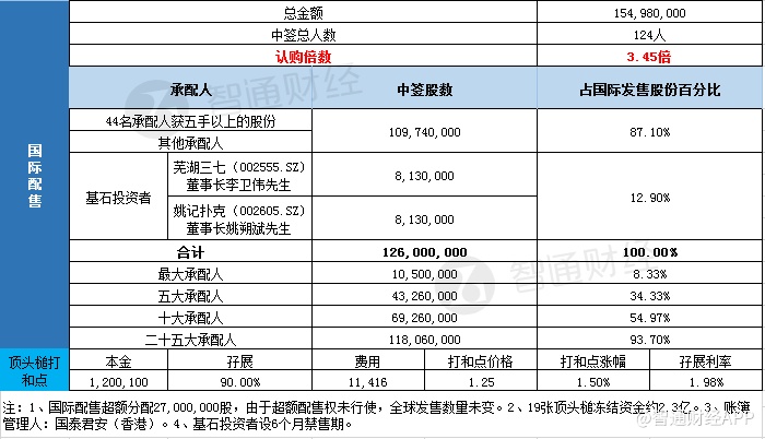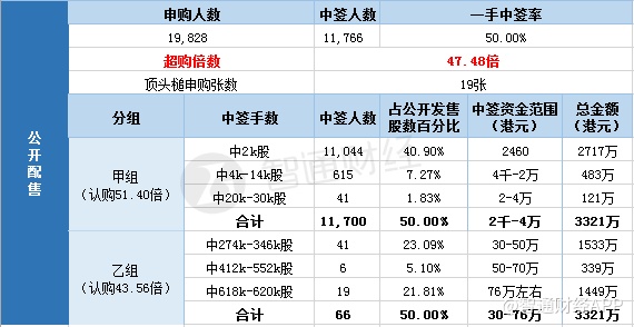 其中,公开配售申购人数19828,一手中签率50%,超购倍数47.48倍。