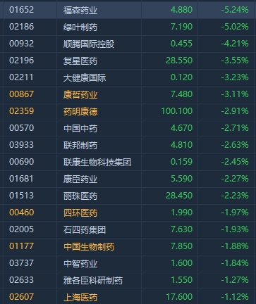 智通财经APP获悉,医药股今日悉数走低,截至发稿,福森药业(01652)、绿叶制药(02186)跌超5%,顺滕国际控股(00932)跌4.21%,大健康国际(02211)、康哲药业(00867)跌超3%,中国中药(00570)、联邦制药(03933)、康臣药业(01681)跌超2%。