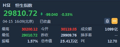 智通财经APP获悉,恒指今日高开低走,早盘涨0.7%,报30119.85点。截至收盘,恒生指数跌99.04点或0.33%,报29810.72点,全日成交额达1099.97亿。国企指数跌0.24%,报11631.86点,红筹指数跌0.08%,报4679.72点。