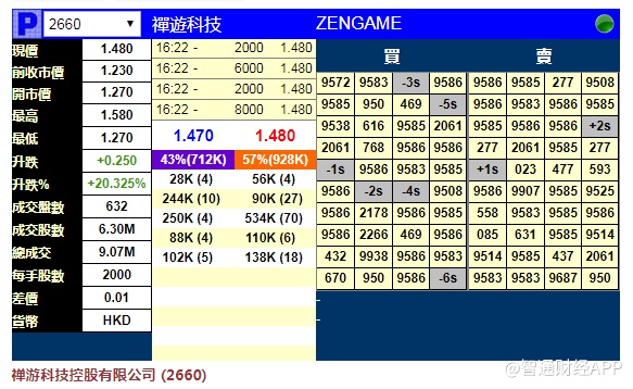 智通财经APP获悉,禅游科技(02660)将于4月16日在香港挂牌,上市前夕,据辉立交易场资料显示,截至发稿,暗盘报1.48港元,较招股价1.23港元,涨20.325%。每手2000股,不计手续费,每手赚500港元。成交额1520万。