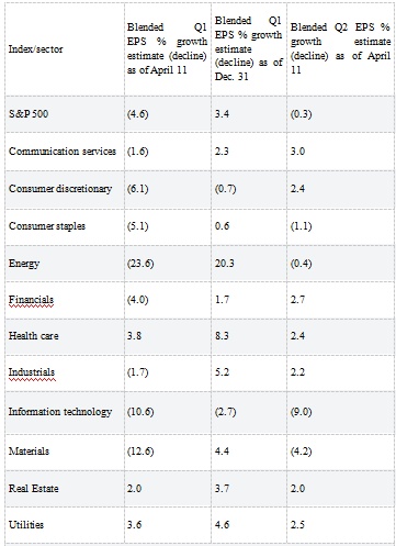 截至上周三下午,标准普尔500指数成份股的505家企业中有25家公布了业绩,综合增长预期为-4.6%,11个行业中有8个预计每股收益将同比下降。这大大低于截至12月31日预计的增幅(3.0%)。