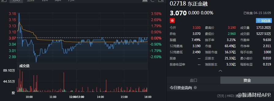 截至今日收盘,东正金融(02718)无涨跌,报3.07港元。