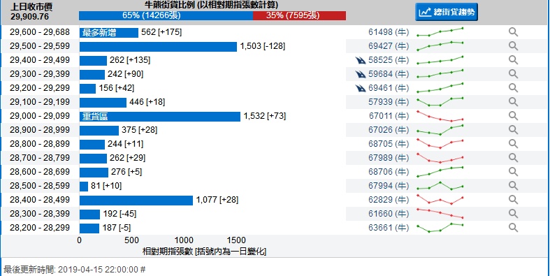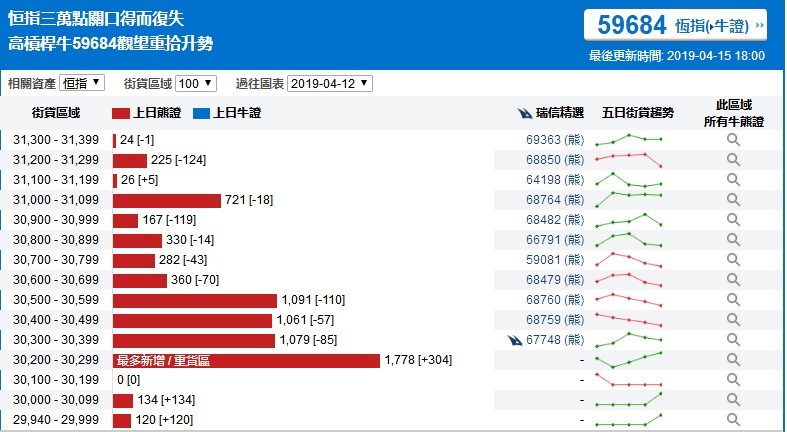智通财经APP获悉,截至4月15日,恒指最新的牛熊街货比例65:35。从瑞信恒指牛熊证街货分布图中得到的数据显示,熊证街货重货区在30200-30299区间,该区间最新熊证数量为1778张,较上一交易日增加304张;最多新增区间在同一区间。牛证街货重货区在29000-29099区间,该区间最新牛证数量为1532张,比上一交易日增加73张;最多新增区间在29600-29688区间。