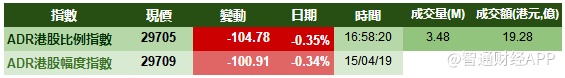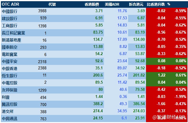 智通财经APP获悉,美股收市微跌,拖累港股ADR指数全日偏软,按比例计算,收报29705点,跌104.78点。汇丰控股收报67.26元,较港收市升0.16元;腾讯控股收报386.54元,较港收市跌1.66元。