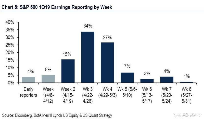 最后,从本周的情况来看,15%的标普500指数成分股公司将公布财报,主要来自金融、医疗和工业等行业。考虑到2018年末和2019年初去风险的数量,以及美国基金整体的“掩体”心态,美国银行预计,“不受欢迎的周期股的意外表现可能会引发市场更大的反应。”