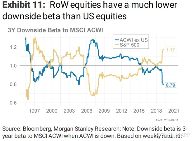包括Wanting Low在内的策略师在给客户的报告中写道,标准普尔500指数对摩根士丹利全球指数(MSCIACWorldIndex)的下行贝塔系数——全球股票下跌时其相对回报的衡量标准——目前正处于金融危机爆发前以来的最高水平。而世界其它地区股市的同样指标已跌至多年低点,这使得它们更具防御性。