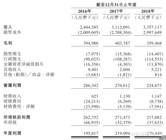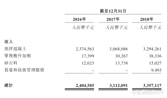 于往绩记录期间,该公司的收入由2016年的人民币2404.6百万元上升至2017年的人民币3112.1百万元并进一步上升至2018年的人民币3357.1百万元,相当于约18.2%的年复合年增长率。总收入的增加主要由于预拌混凝土的销售收入增加。