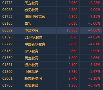 智通财经APP获悉,今日教育板块表现强劲,多只个股涨幅均超7%。截至14时33分,天立教育(01773)及睿见教育(06068)涨超9%,澳洲成峰高教(01752)涨7.35%,中教控股(00839)涨4.86%,21世纪教育(01598)涨4.86%,宇华教育(06169)涨3.99%,新高教(02001)涨2.19%。