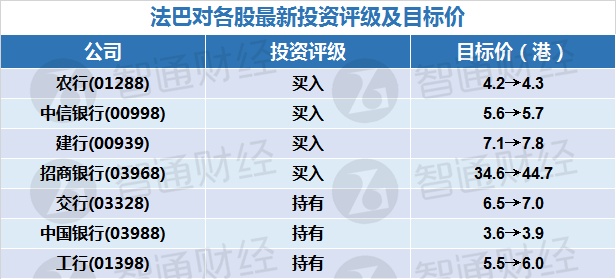 法巴更新对各内银股的投资评级及目标价,给予农行(01288)、中信银行(00998)以及建行等“买入”评级;给予交行(03328)、中国银行(03988)和工行(01398)“持有”评级。
