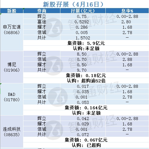 智通财经APP获悉,申万宏源(06806)、博尼(01906)、B&D(01780)和连成科技(08635)正在招股中,截至4月16日,辉立、耀才以及信诚等券商分别为其借出1.5702亿、9.7亿、0.053亿和0.072亿;申万宏源和B&D孖展未足额,博尼超购逾52倍,连成科技已超购。