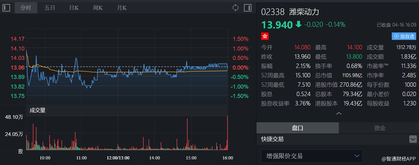 截至今日收盘,潍柴动力(02338)收跌0.14%,报13.94港元。