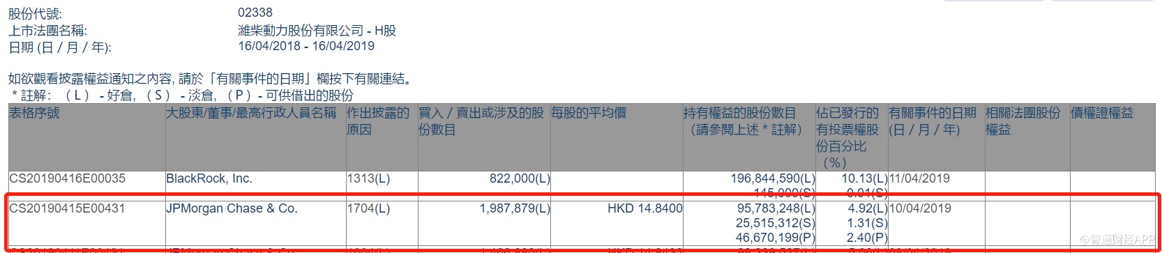 智通财经APP获悉,根据联交所资料显示,摩根大通于4月10日减持潍柴动力(02338)198万股,每股作价14.84港元,总值约2938.32万港元,最新持股数目约9578.32万股,最新持股比例为4.92%。
