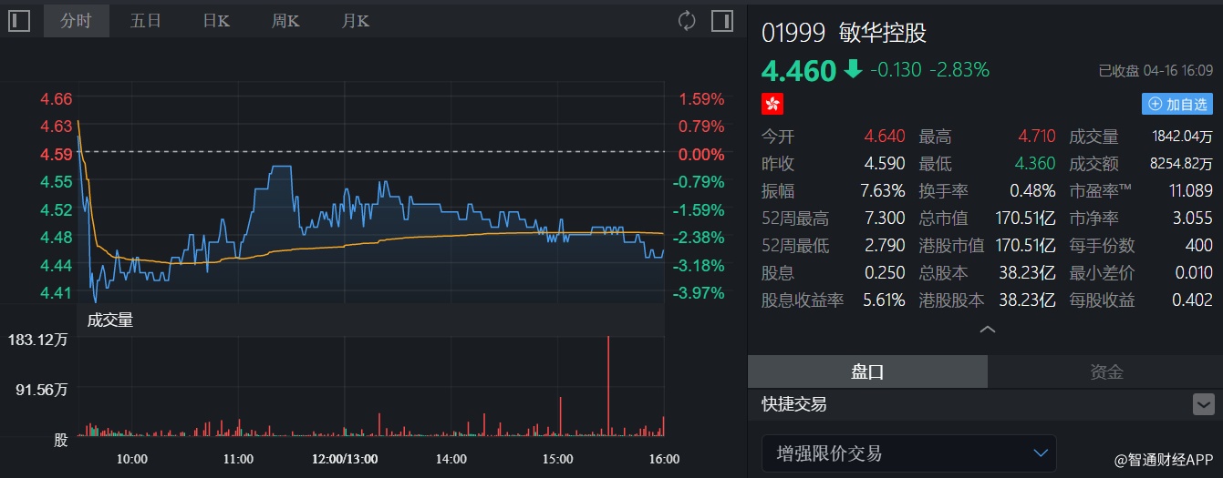截至今日收盘,敏华控股(01999)收跌2.83%,报4.46港元。