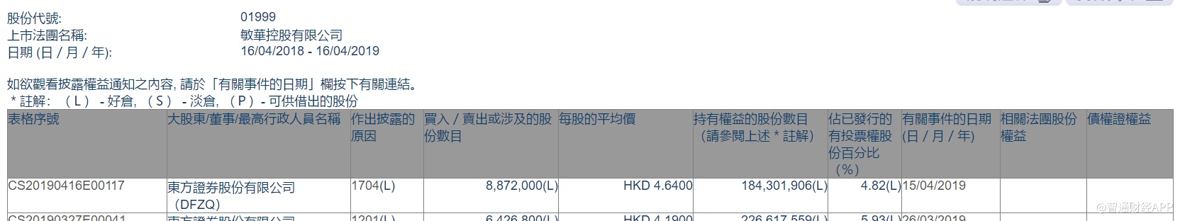 智通财经APP获悉,根据联交所资料显示,东方证券股份于4月15日减持敏华控股(01999)887万股,每股作价4.64港元,总值约4115.68万港元,最新持股数目约1.84亿股,最新持股比例为4.82%。