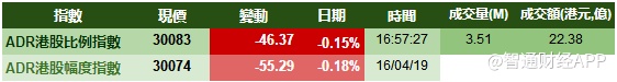 智通财经APP获悉,美股上涨,但港股ADR指数全日偏软,按比例计算,收报30083点,跌46.37点。大型蓝筹全线走强,汇丰控股收报67.97元,较港收市升0.37元;腾讯控股收报394.5元,较港收市升0.9元。