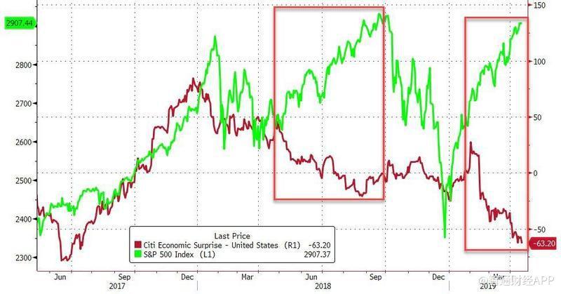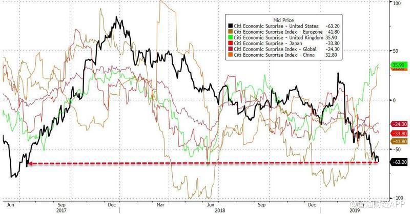 在美国股市不断攀升并逼近历史高点的同时,美国经济数据出人意料地处于2017年7月以来的最低水平,而且还是目前全球主要经济体中表现最差的。