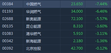 浙江省下调天然气门站价格,燃气股集体急挫。中国燃气(00384)跌7.44%,华润燃气(01193)跌6.46%,新奥能源(02688)跌5.57%,昆仑能源(00135)跌3.6%。