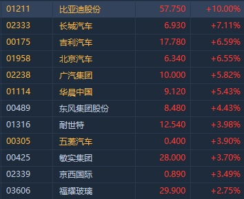 智通财经APP获悉,A股汽车板块午后强势走高,板块内涨停个股多达11只,港股汽车板块个股亦纷纷跟随走高,截至发稿,比亚迪股份(01211)涨10%,长城汽车(02333)涨7.11%,吉利汽车(00175)涨6.59%,北京汽车(01958)涨6.55%,广汽集团(02238)涨5.82%。