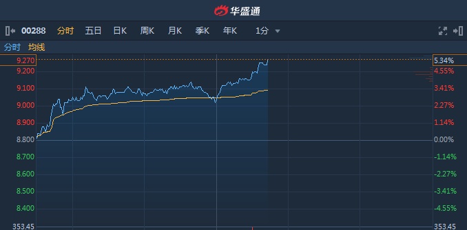 智通财经APP获悉,中国拟大量进口美国猪肉,万洲国际(00288)股价大幅上扬。截至13时42分,涨5.23%,报价9.26港元,成交额5.049亿。