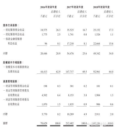 其中,截至2016年、2017年及2018年财政年度,自股权资本市场服务产生佣金及费用收益占总收入分别约62.9%、69.5%及64.0%。透过代表客户执行于联交所及其他选定海外市场上市的股票及债务证券交易及下达交易指示自经纪服务产生佣金收益,其占总收入分别约26.3%、16.7%及17.3%。
