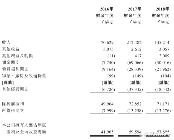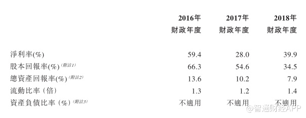 招股书显示,截至2016年、2017年及2018年财政年度,净利率分别为59.4%、28%以及39.9%。于2016年财政年度至2017年财政年度净利率下降主要由于,该集团的佣金开支、僱员福利开支及其他经营开支持续增加,且增幅高于收入的增加,导致净利率下降。