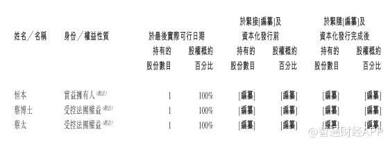 其中,恒本的已发行股本由蔡博士合法实益拥有50%,及由蔡太合法实益拥有50%。根据《证券及期货条例》第XV部,蔡博士及蔡太各自被视为于恒本拥有权益的股份中拥有权益。