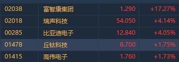 智通财经APP获悉,苹果概念股今日随大市走升,截至发稿,瑞声科技(02018)涨4.14%,比亚迪电子(00285)涨4.05%,丘钛科技(01478)涨1.75%,高伟电子(01415)涨1.73%。